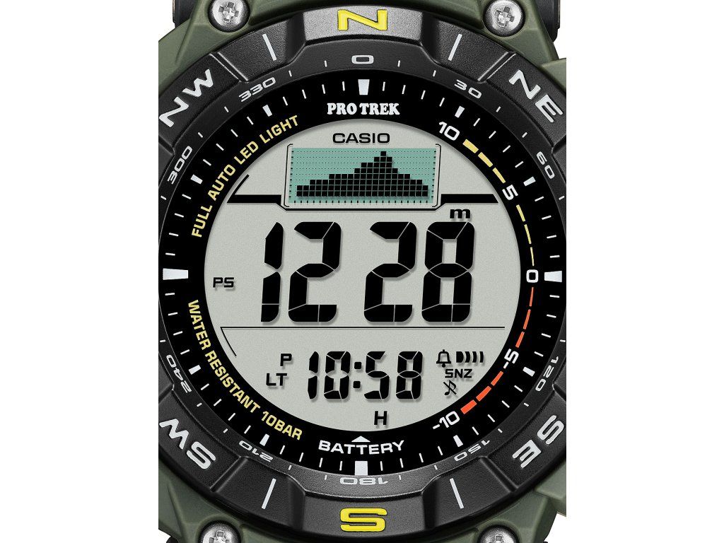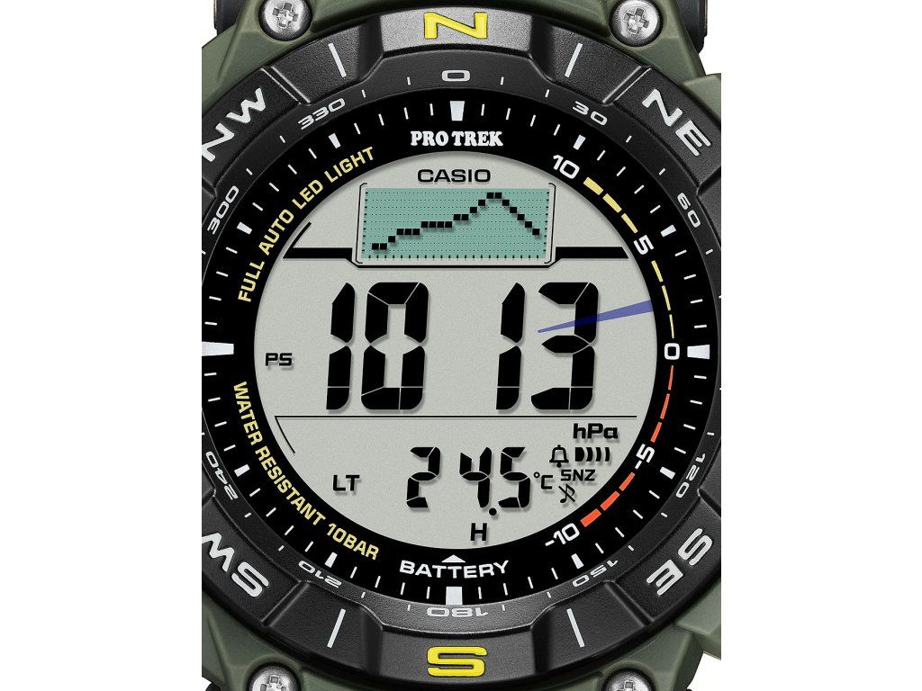 | Funkcie: | 12-24 h, 5 day alarm, Automatic calender, Barometer, Date, Altimeter, cold resistant, Compass, Minute, Snooze alarm, Second, Solar, Sunrise & sunset, Stop function, Hour, Thermometer, Timer, Worldtimer |