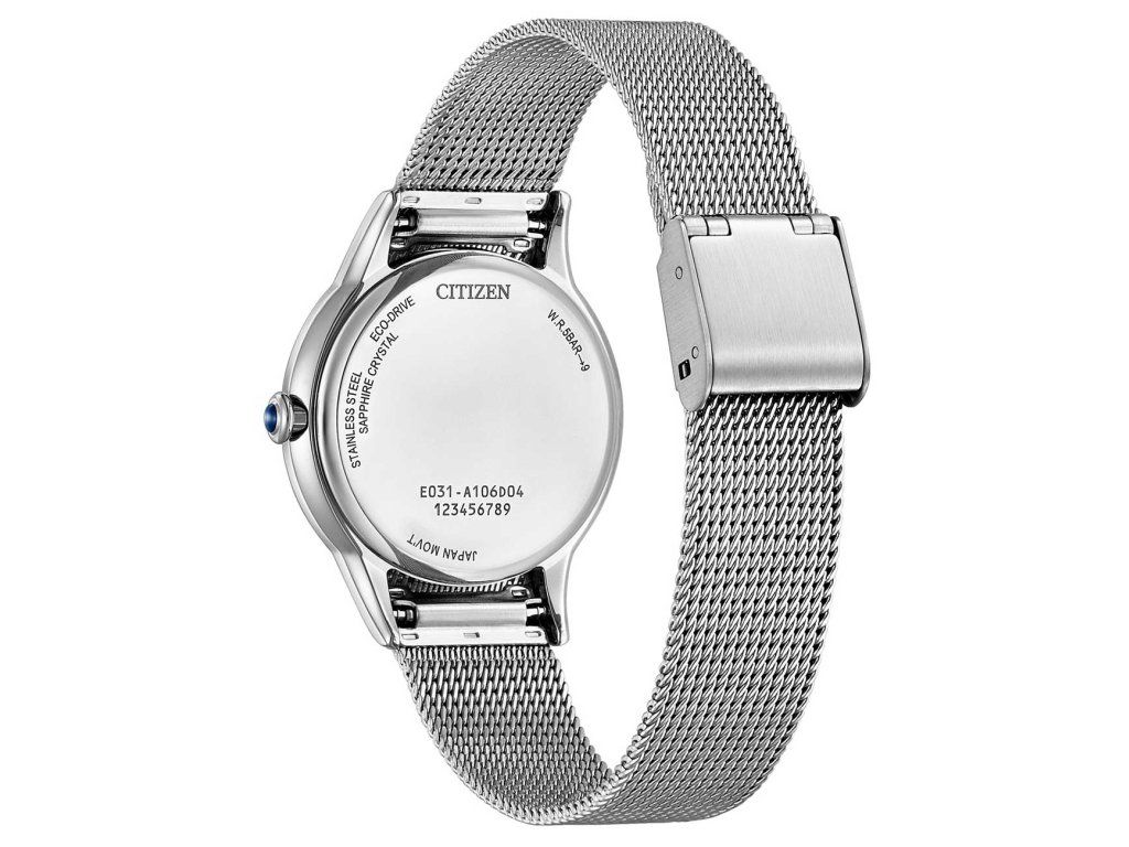 Dámske hodinky Citizen EM1150-86D sú elegantným spoločníkom z modelového radu Citizen L Eco-Drive 32,5mm 5ATM. Ideálna voľba, ak hľadáte hodinky s elegantným a zároveň moderným vzhľadom.Srdcom týchto hodiniek je špičkový solárny pohon Citizen Eco-Drive. Solárny pohon Eco-Drive premieňa akýkoľvek druh svetla na energiu na napájanie hodiniek a prebytok ukladá do batériového článku. Na jedno plné nabitie fungujú hodinky Eco-Drive celé mesiace aj v tme bez potreby pravidelnej výmeny batérie. Eco-drive je navrhnutý tak, aby sa nabíjal z bežných každodenných zdrojov svetla, ako sú vnútorné osvetlenie, stolové lampy a slnečné svetlo. Ak chcete hodinky úplne nabiť, nechajte ich nabíjať 8-12 hodín na priamom slnečnom svetle alebo 130 hodín pri umelom osvetlení. Môžete sa venovať svojmu každodennému životu s istotou, že sa vaše hodinky nikdy nezastavia.