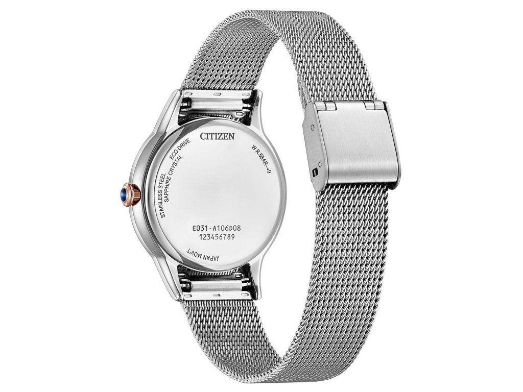 Dámske hodinky Citizen EM1156-80X sú elegantným spoločníkom z modelového radu Citizen L Eco-Drive 32,5mm 5ATM. Ideálna voľba, ak hľadáte hodinky s elegantným a zároveň moderným vzhľadom.Srdcom týchto hodiniek je špičkový solárny pohon Citizen Eco-Drive. Solárny pohon Eco-Drive premieňa akýkoľvek druh svetla na energiu na napájanie hodiniek a prebytok ukladá do batériového článku. Na jedno plné nabitie fungujú hodinky Eco-Drive celé mesiace aj v tme bez potreby pravidelnej výmeny batérie. Eco-drive je navrhnutý tak, aby sa nabíjal z bežných každodenných zdrojov svetla, ako sú vnútorné osvetlenie, stolové lampy a slnečné svetlo. Ak chcete hodinky úplne nabiť, nechajte ich nabíjať 8-12 hodín na priamom slnečnom svetle alebo 130 hodín pri umelom osvetlení. Môžete sa venovať svojmu každodennému životu s istotou, že sa vaše hodinky nikdy nezastavia.