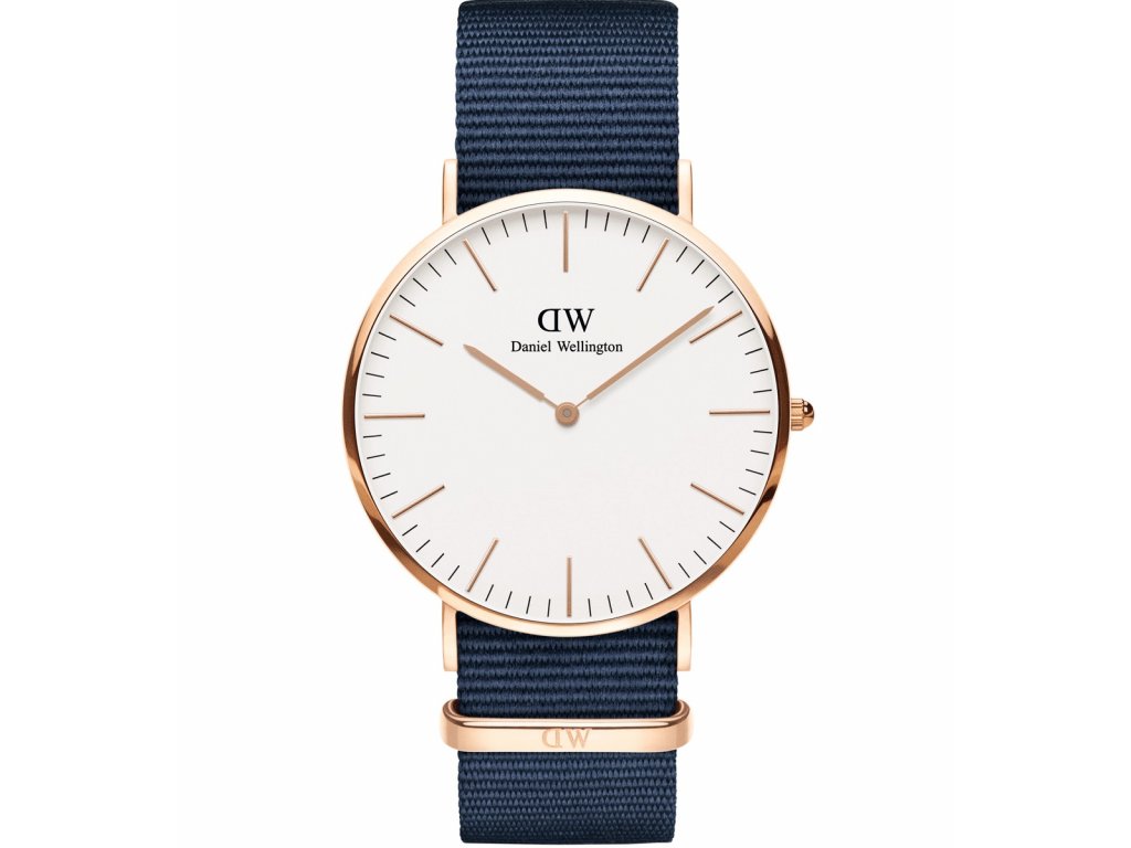 Unisex náramkové hodinky značky Daniel Wellington. Model z kolekcie Classic. Hodinky v jednoduchom dizajne v kombinácii ružovo zlatej leštenej ocele s bielym ciferníkom. Púzdro hodiniek je vyrobené z ušľachtilej ocele, ktoré dokonale ladí s modrým nylonovým remienkom. Vodotesnosť hodiniek je 30m resp. 3ATM.