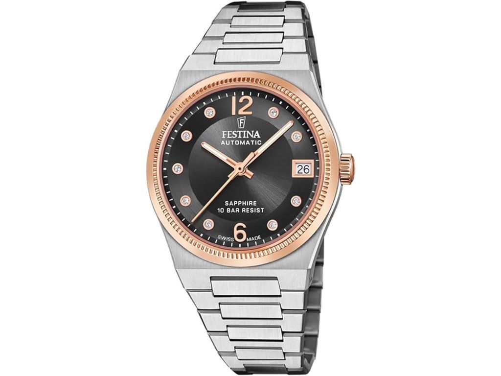 Dámske hodinky Festina F20031/3 sú elegantným spoločníkom z modelového radu Swiss Made Rivé Automatic 35mm 10ATM. Ideálna voľba, ak hľadáte hodinky s elegantným a zároveň moderným vzhľadom.Srdcom týchto hodiniek je Automatický strojček, ktorý, ako je u hodiniek Festina zvykom, zaručuje presné meranie času.