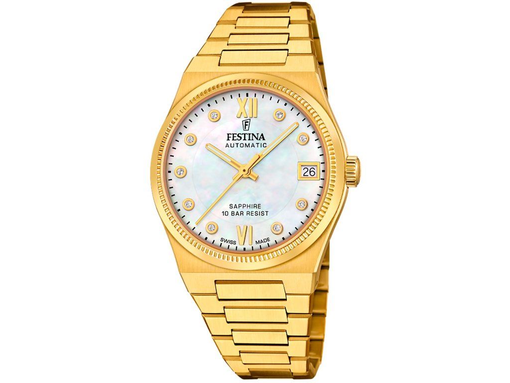 Dámske hodinky Festina F20033/1 sú elegantným spoločníkom z modelového radu Swiss Made Rivé Automatic 35mm 10ATM. Ideálna voľba, ak hľadáte hodinky s elegantným a zároveň moderným vzhľadom.Srdcom týchto hodiniek je Automatický strojček, ktorý, ako je u hodiniek Festina zvykom, zaručuje presné meranie času.