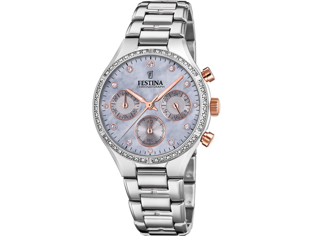 Dámske hodinky Festina F20401/3 sú elegantným spoločníkom z modelového radu Boyfriend chronograph 36mm. Ideálna voľba, ak hľadáte hodinky s elegantným a zároveň moderným vzhľadom.Srdcom týchto hodiniek je Quartz (batériový) strojček, ktorý, ako je u hodiniek Festina zvykom, zaručuje presné meranie času.