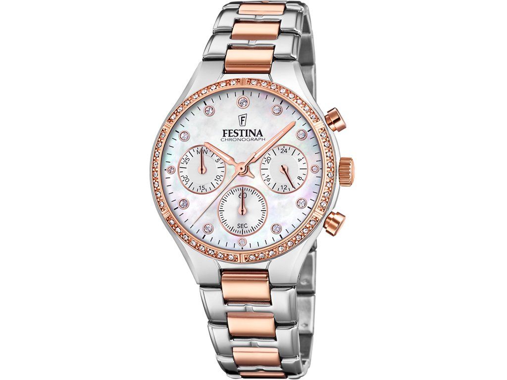 Dámske hodinky Festina F20403/1 sú elegantným spoločníkom z modelového radu Boyfriend chronograph 36mm. Ideálna voľba, ak hľadáte hodinky s elegantným a zároveň moderným vzhľadom.Srdcom týchto hodiniek je Quartz (batériový) strojček, ktorý, ako je u hodiniek Festina zvykom, zaručuje presné meranie času.