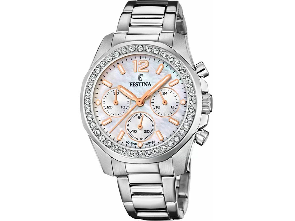 Dámske hodinky Festina F20606/1 sú elegantným spoločníkom z modelového radu ladies Chronograph 38 mm. Ideálna voľba, ak hľadáte hodinky s elegantným a zároveň moderným vzhľadom.Srdcom týchto hodiniek je Quartz (batériový) strojček, ktorý, ako je u hodiniek Festina zvykom, zaručuje presné meranie času.