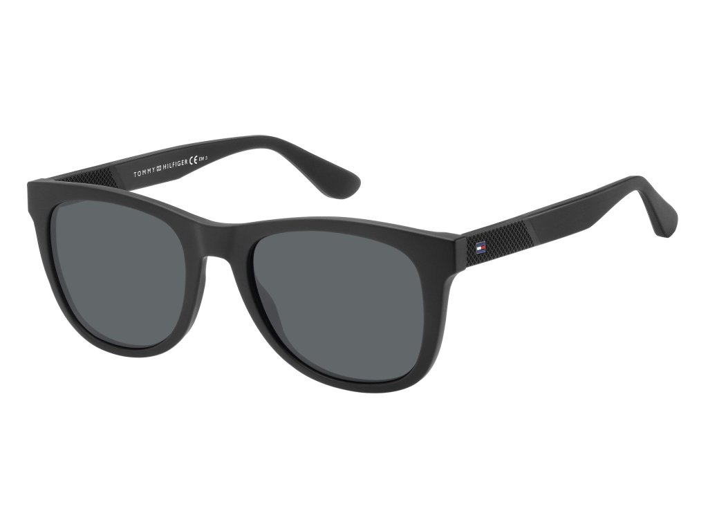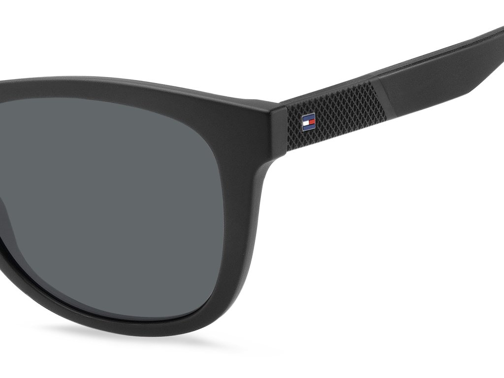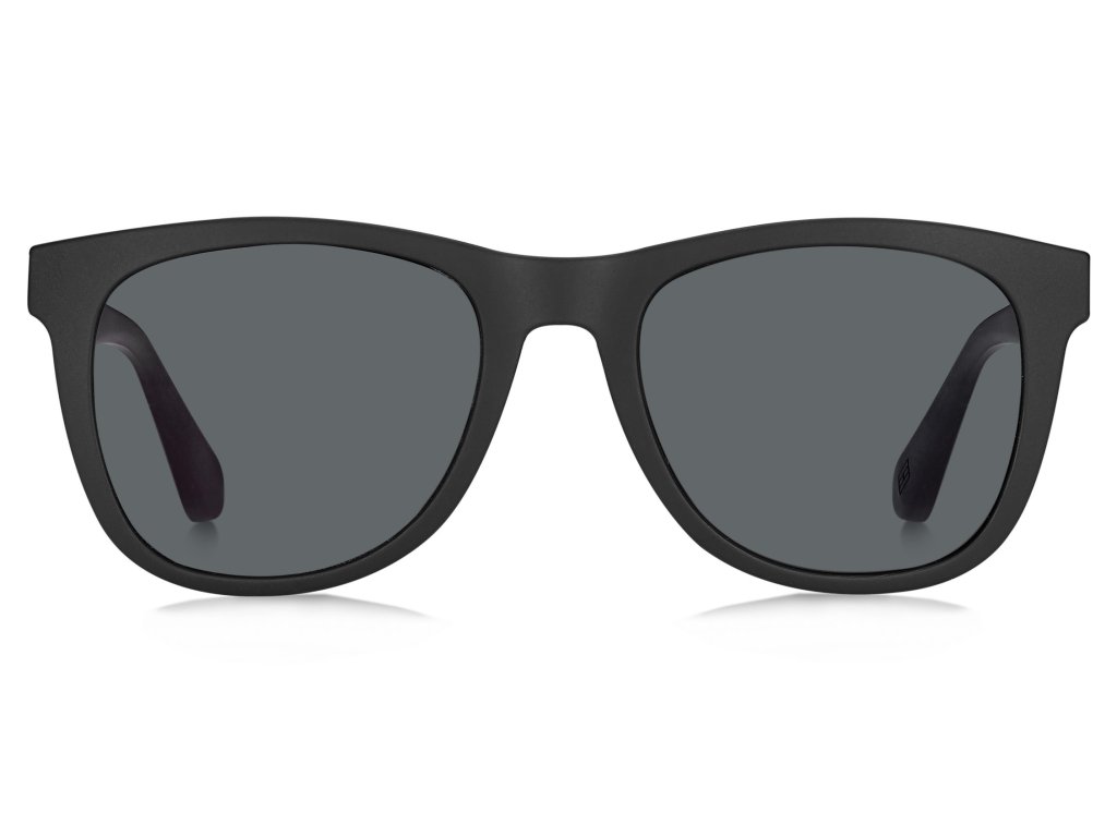 Pánske slnečné okuliare Tommy Hilfiger s hranatým matným čiernym rámom a sivými šošovkami.